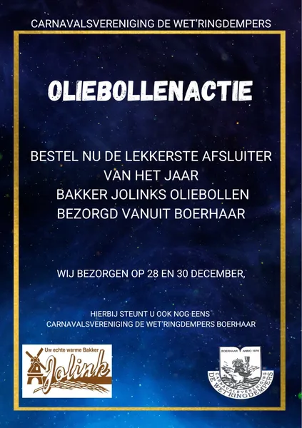 Oliebollen: TARWEbloem, water, rozijnen, krenten, gist, EI, suiker, palm, bakkerszout, MELKpoeder, raapzaad, kokos, TARWEgluten, appelpuree (concentraat), glucose-fructosestroop, citroenschil, glucosestroop, zonnebloem, palm, ROGGEbloem (voorverstijfseld), abrikozenpuree, E471, perzikpuree (concentraat), wei-eiwit (concentraat)(MELK), weipoeder(MELK), dextrose, E422, E481, SOJAbloem, TARWEvezel, e472e(TARWE), sinaasappelsap, aardappelzetmeel (gemodificeerd), aroma, citroen, E100, E160a, E202, e224(SULFIET), E300, E300, e322(SOJA), E330, E440, E475, E500, E535, E920, enzymen(TARWE), kaliumjodide, MELKeiwit, sinaasappel